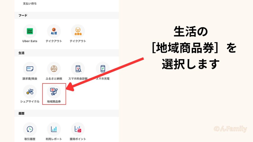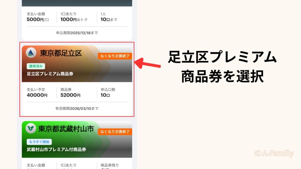 ⚫︎ 「地域商品券」を選択、「足立区プレミアム商品券」をクリック